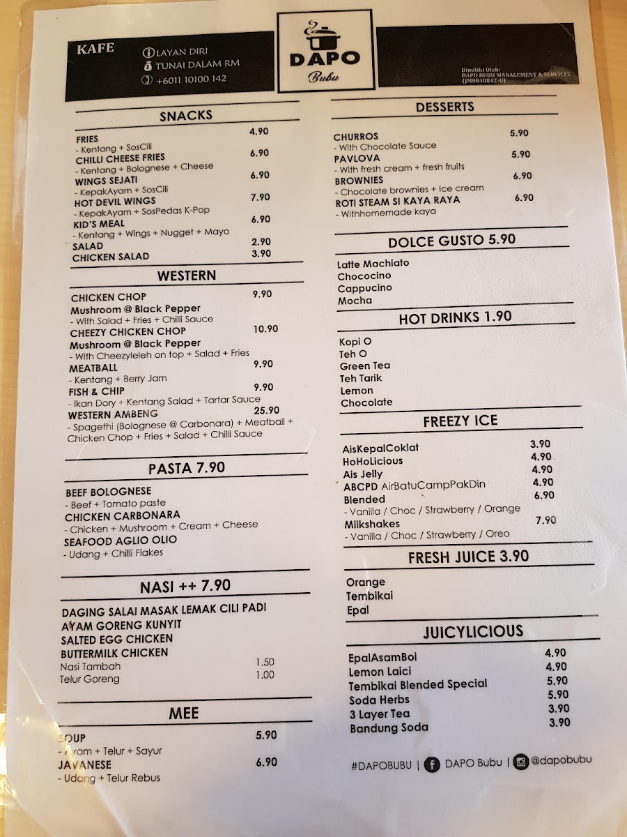 DAPO Bubu, located at No. 63, Taman Orkid Baru, is a charming café in Labis, Johor, offering a delightful fusion of Western comfort food and local favorites. As you step inside, the cozy ambience envelops you, making it an ideal spot for casual dining. The menu shines with highlights such as the Chicken Chop, available with a choice of black pepper or mushroom sauce, and the addictive Hot Devil Chicken Chop. Their Fish & Chips paired with homemade tartar sauce is also a crowd-pleaser.